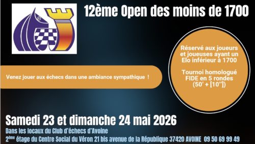 - Prochains opens sur Avoine – Open moins de 1700 élo du 23 et 24 mai et 40ème Open du 18 au 26 Juillet